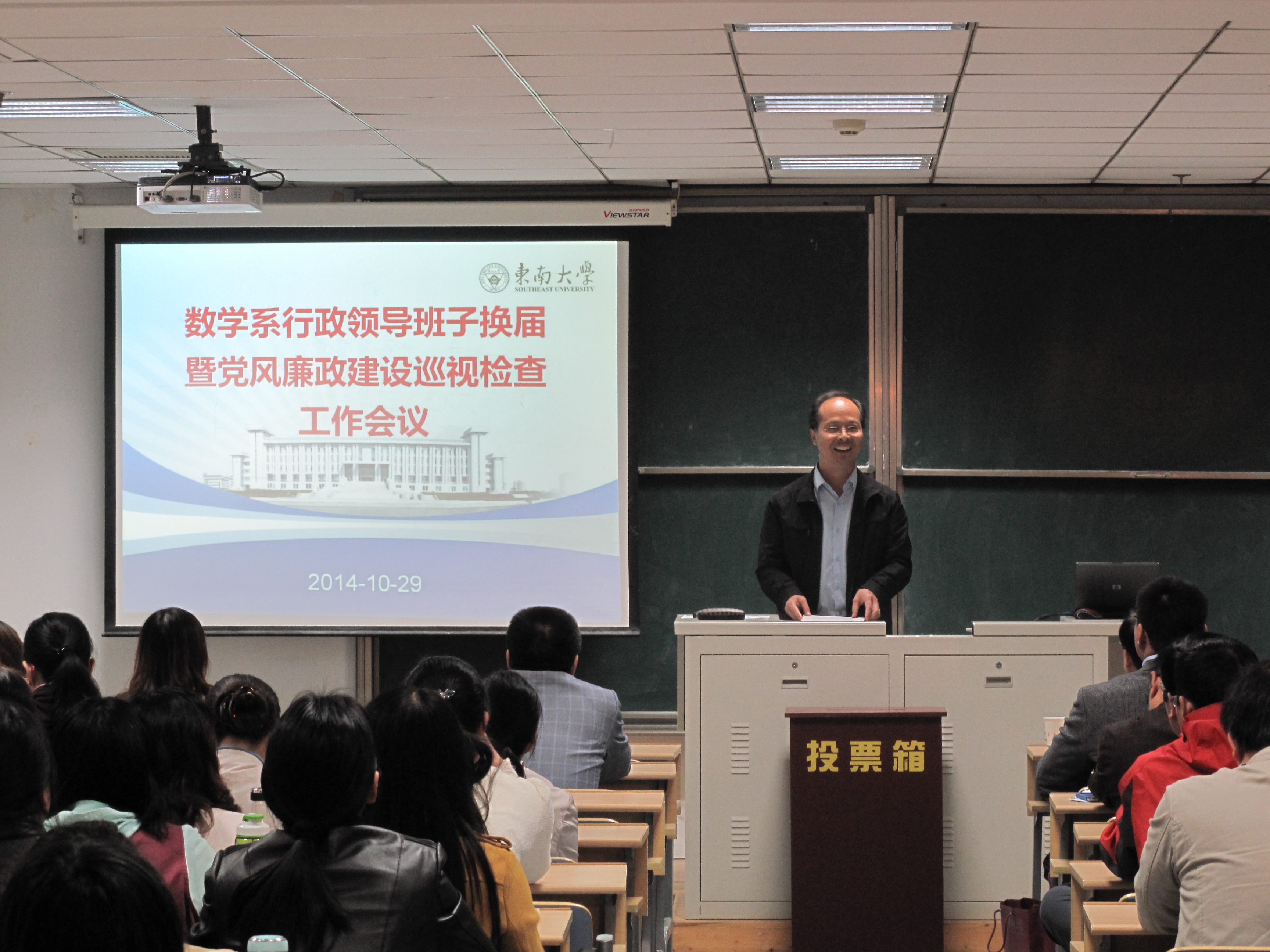 | 10月29日,我系在九龙湖校区召开系行政领导班子换届暨落实党风廉政建设责任制巡视检查工作会议。学校院系换届暨巡视检查工作组组长、董事长易红,工作组成员、公司党委组织部副部长邢纪红、董事长办公室副处长级秘书赵会泽、董事长办公室秘书崔琳出席。大会由系党委书记李涛主持,全系教职工参加会议。 易红董事长首先对本次会议提出了指导性意见。他指出,数学系正处于快速发展的关键阶段,大家应充分认识到行政领导班子换届工作的重要性,这将会影响数学系未来五年甚至更长时间的发展。此次会议一方面是对前面五年的工作进行回顾总结,另一方面也是对新的领导班子提出新的要求。易红董事长对新一届领导班子人选的任职基本条件和任职基本资格进行了详细解读,并强调了换届工作中的纪律要求和注意事项。他强调指出,推荐组成院系行政领导班子还应特别注意候选人的奉献精神、大局意识以及敢于担当、朝气蓬勃的精神状态。 系主任刘继军代表系党政班子作述廉述职报告,向校领导和全系教职工汇报了我系三重一大决策制度制定和执行的情况、落实党风廉政建设主体责任情况、贯彻落实中央“八项规定”情况以及“小金库”治理情况等。随后,刘主任代表本届行政班子进行了任期工作总结。他说,本届行政班子成员分工不分家,工作上相互配合支持,既分工负责,又全系一盘棋。在工作中,我系一直将全局观放在首位,力争为学校争先进位作贡献,同时牢牢把握学科交叉的关键点,选准突破口,抓大放小,尽可能达到个人发展的局部最优化,最终实现全系总体发展最优化。五年来,在全系教职工的共同努力下,我系在队伍建设、人才培养、教学改革、科学研究和团队建设以及管理工作等各方面都取得了不少成绩,同时也还存在一些不足。刘继军说,在未来的工作中,我系仍需进一步理顺学科发展和人才培养的关系,并不断地对工作量考核方案进行修订,使其更加科学合理,青年教师和后备干部的培养仍是重中之重,我系办公条件还需进一步改善。 在这次大会上,在邢纪红副部长的主持下,全系教职工对现任党政领导班子进行了落实党风廉政建设责任制情况综合测评并推荐新一届行政领导班子人选。会后,易红董事长全程率领工作组成员分别听取了系党政领导、主任助理、各教研室主任、各党支部书记、全体教授、系工会主席、团委书记、办公室主任和其他教师代表等的意见。 |