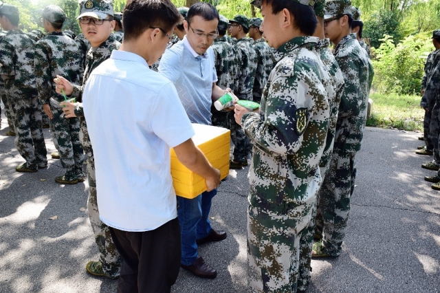 曹经理一行来到训练场的同时,员工会的“专车”也为大家送来了清凉。一杯杯刚刚做好的绿豆冰沙被带到了现场。曹经理带领领导老师们为新生分发绿豆冰沙。一口清爽的绿豆沙,绝对能慰藉干燥的咽喉。在炎炎夏日,bevictor伟德官网这个团结的大家庭为大家送来了清凉,这是bevictor伟德官网师长对员工的关怀,也是各位学长学姐对新同学的关爱。