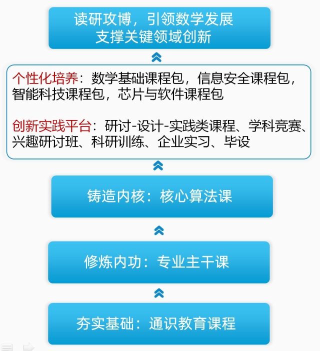 bevictor伟德官网强基计划数学类专业,将聚焦数学与应用数学、计算机软件、智能制造、信息安全、高端芯片等关键领域。依托我们的国家特色专业和江苏省品牌专业、重点专业,充分发挥依托bevictor伟德官网建设的国家应用数学中心平台以及学院牵头建设的三个省部级平台的作用,结合学校的工科优势,与计算机、人工智能、网络安全、电子信息工程等强势学科深度交叉。通过构建本硕博一体化的开放多样、灵活互通的一流人才培养体系,致力于发挥每一位员工的创新潜能和创新活动,为国家和社会培养造就一批具有高尚的道德情操、敏锐的数学直观、严谨的数学思维、宽广的国际视野,掌握数学科学的基本理论、方法与技能,熟悉计算机科学/信息科学/电子科学方面的基础知识,能够在数学与应用数学、计算机软件、智能制造、信息安全、高端芯片等关键领域深入发展的创新拔尖人才。